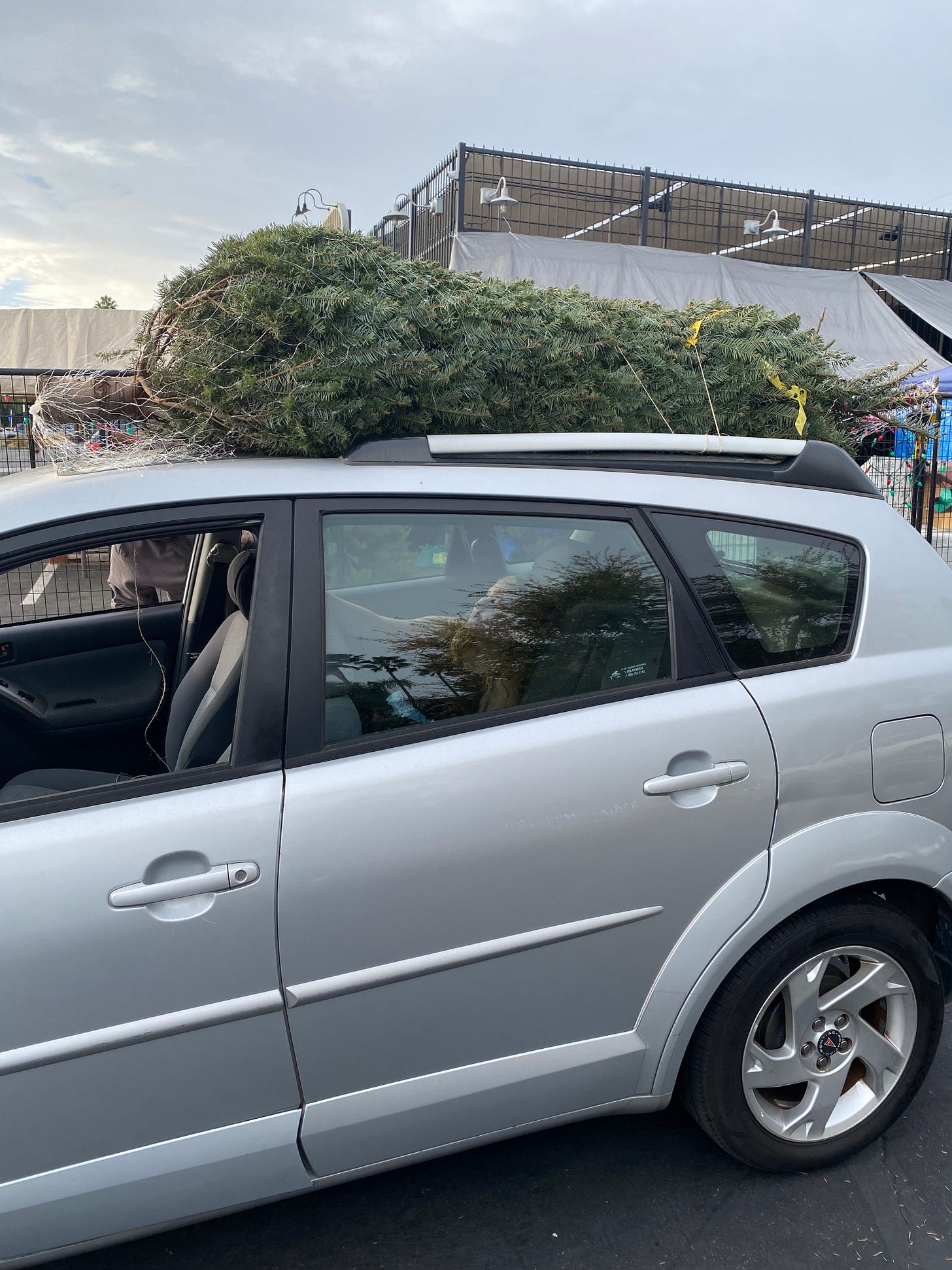 We are asked “which tree,” a funny question considering all the trees are wrapped up like corpses, stacked on top of one another. We tell him which kind (noble, 6-7 feet), he grabs the top one, it works, we pay. He then hands a spool of twine and scissors to Landon, who is now in charge of strapping the tree to my car. He does his best, then as I drive off, I’m stopped by the employees. We were driving away with the twine and scissors on top of my car. So close.